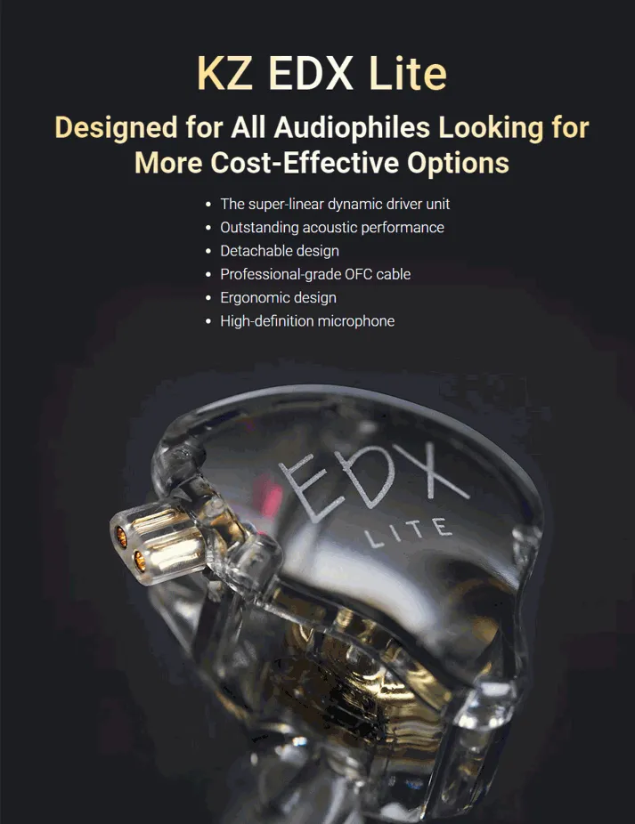 - Equipped with a dynamic driver, the KZ EDX Lite produces deep bass, balanced mids, and crisp highs. Its 23±3Ω impedance and 108±3 dB sensitivity ensure loud and clear audio even on low-power devices like smartphones. Moreover, the wide frequency response of 20 Hz to 40,000 Hz allows you to enjoy every detail of your favorite tracks.