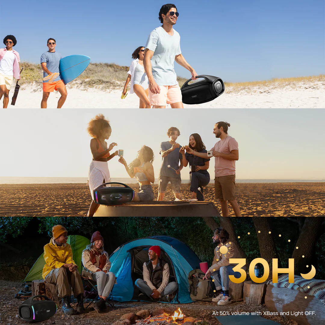 Whether you’re streaming dance tracks, hip-hop beats, or cinematic soundscapes, the speaker produces deep, punchy bass, clear mids, and sparkling highs that captivate the ears and keep the party going.