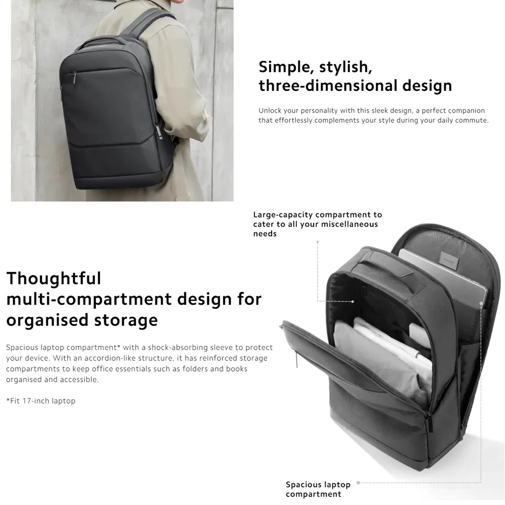 The Xiaomi Mijia Business Backpack is designed with multiple storage sections to keep your belongings neatly arranged: